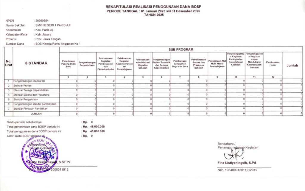 Rekapitulasi Realisasi Penggunaan Dana BOS Tahun 2025 SMK Negeri 1 Pakis Aji merupakan laporan pertanggungjawaban yang menyajikan informasi pelaksanaan dan penggunaan Dana Bantuan Operasional Sekolah (BOS) secara rinci, transparan, dan akuntabel. Data yang disajikan mencakup perencanaan, penyaluran, serta realisasi anggaran pada setiap komponen pembiayaan sesuai dengan ketentuan yang berlaku.
