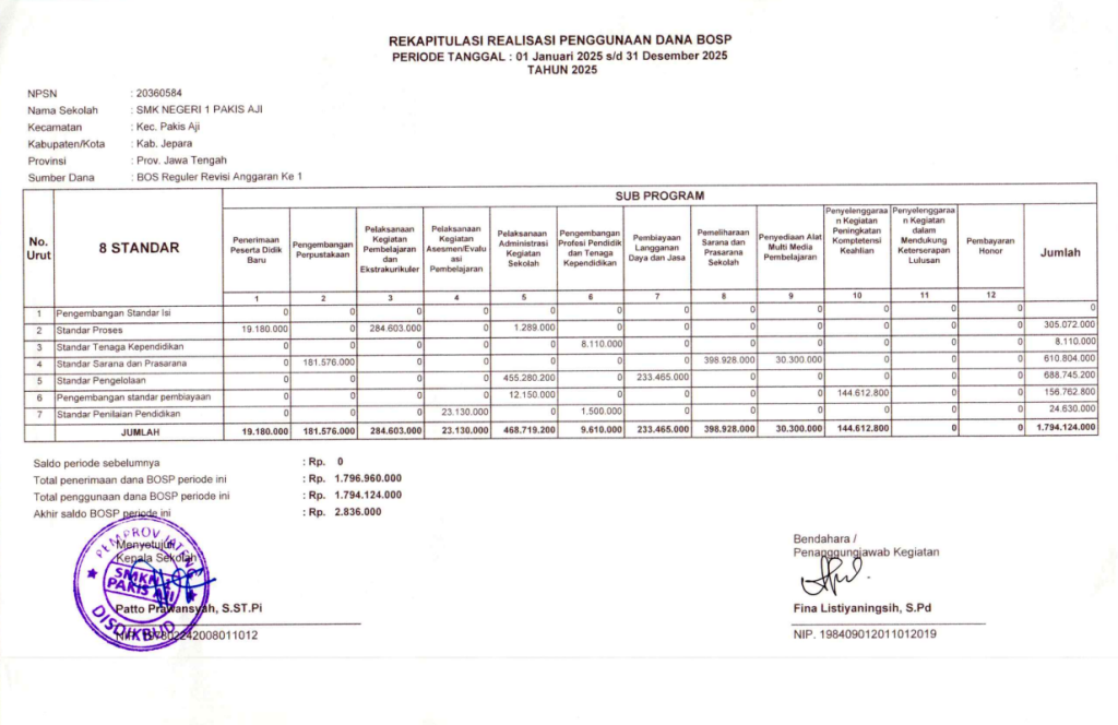 Rekapitulasi Realisasi Penggunaan Dana BOS Tahun 2025 SMK Negeri 1 Pakis Aji merupakan laporan pertanggungjawaban yang menyajikan informasi pelaksanaan dan penggunaan Dana Bantuan Operasional Sekolah (BOS) secara rinci, transparan, dan akuntabel. Data yang disajikan mencakup perencanaan, penyaluran, serta realisasi anggaran pada setiap komponen pembiayaan sesuai dengan ketentuan yang berlaku.